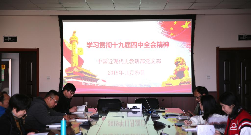 11月26日,根据上级党组织安排,中国近现代史教研部党支部在J9-223会议室召开专题会议,认真学习党的十九届四中全会精神。会议由支部书记宋开金主持,副经理邵勇与支部全体党员参加。