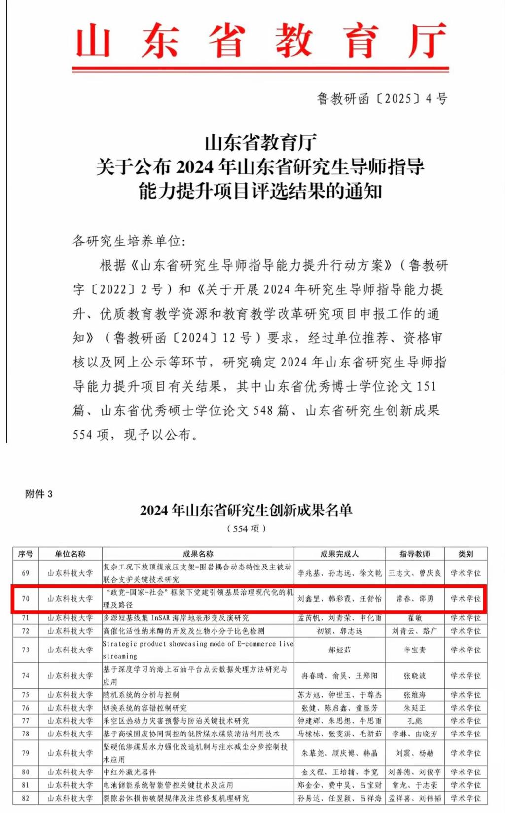 近日,山东省教育厅公布了2024年度山东省研究生创新成果获奖名单,公司研究生刘鑫罡、韩彩霞、汪舒怡(指导教师:常春教授、邵勇教授)申报的《“政党-国家-社会”框架下党建引领基层治理现代化的机理与路径研究》成功入选。