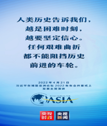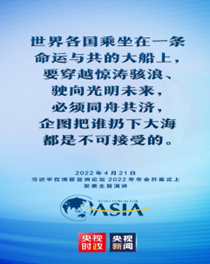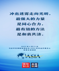 4月21日上午,博鳌亚洲论坛2022年年会开幕式在海南博鳌举行,国家主席习近平以视频方式发表题为《携手迎接挑战,合作开创未来》的主旨演讲。
