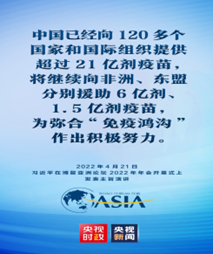 3.China has provided over 2.1 billion doses of vaccines to more than 120 countries and international organizations. China will follow through the pledged donation of 600 million and 150 million doses of vaccines to Africa and ASEAN countries respectively, as part of our effort to close the immunization gap.
