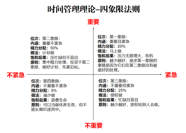 凡事都有轻重缓急,所以一定要明确什么事情是最重要的,把它们提到效率最高的时间段来做。比如有人认为英语口语很重要,所以在起床后最清醒的时间段先去墨水河边完成今天的口语练习。著名的四象限法则工作法就是基于这样的观念来进行操作的。我们可以把学习工作按重要程度和紧急程度两个维度进行划分,大致可分为四个“象限”:既紧急又重要、重要但不紧急、紧急但不重要、既不紧急也不重要。如此安排任务,有利于每天高效有序地完成计划。要把精力主要放在重要但不紧急的事务处理上,需要很好地安排时间。一个好的方法是建立预约。建立了预约,自己的时间才不会被别人所占据,从而有效地开展工作。
