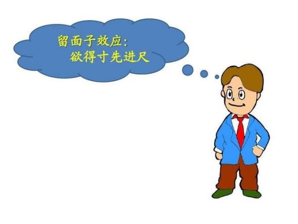 心理学家认为,门面效应的产生,主要是因为人们在拒绝别人的大要求的时候,感到自己没有能够帮助别人,损害了自己富有同情心、乐于助人的形象,辜负了别人对自己的良好愿望,会感到一点内疚。这时,为了恢复在别人心目中的良好形象,也达到自己心理的平衡,便欣然接受了第二个小一点的要求。《论语》说讲到的“取乎其上,得乎其中;取乎其中,得乎其下;取乎其下,则无所得矣”,正是对门面效应的一种阐释。
