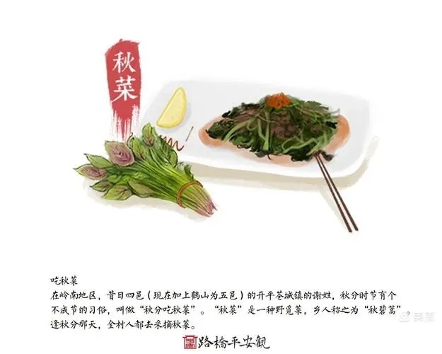 除了“竖蛋”,人们在秋分时还喜欢吃“秋菜”,被称为“秋分吃秋菜”。“秋菜”是一种野苋菜,乡人称之为“秋碧蒿”。秋分那天,人们采回“秋菜”与鱼片炖煮,名曰“秋汤”。有顺口溜道:“秋汤灌脏,洗涤肝肠。阖家老少,平安健康。”一年自秋,人们祈求的还是家宅安宁,身壮力健。