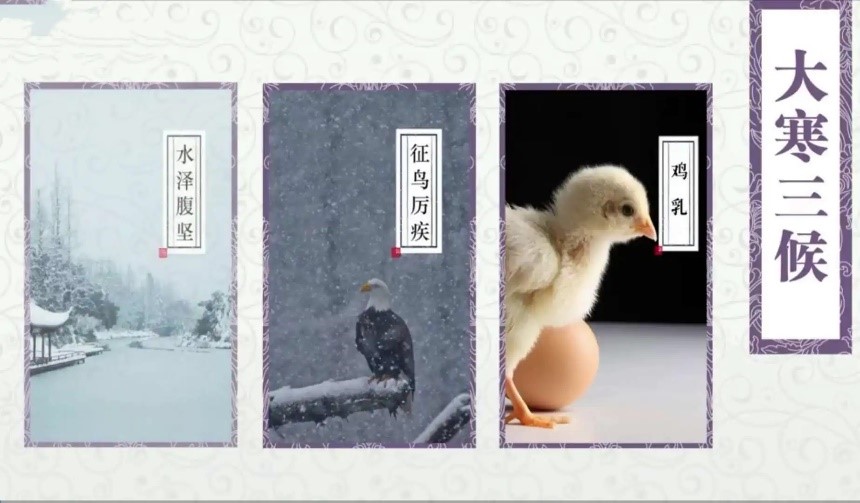 大寒有三候:一候鸡乳;二候征鸟厉疾;三候水泽腹坚。分别指的是大寒节气家禽开始孵化鸡仔、鹰隼之类的征鸟正处于捕食能力极强的状态、水域中央的冰被冻得异常坚固三种物候现象,呈现了自然界的发展规律。