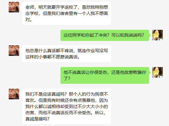 假期最后一天,收到一位同学关于真诚的问题,倾诉舍友之间的矛盾,说到舍友不说真话,认为这就是人际关系中的不真诚。同时,这位同学还说到自己既讨厌他的做法,却又羡慕他,少年成长的迷茫跃然纸上。