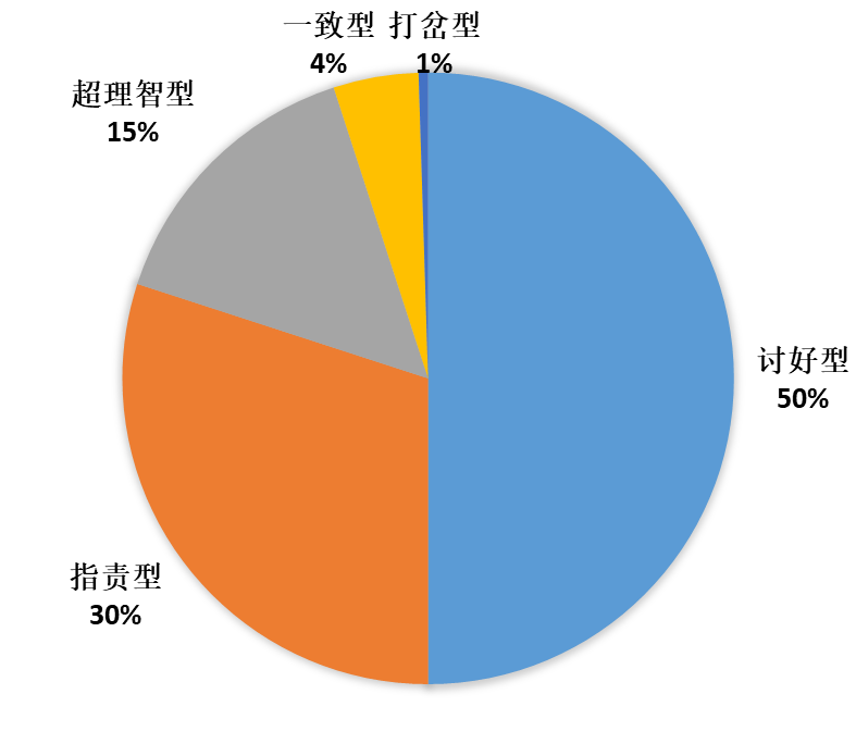 如图中所示,通常我们在压力状态下的沟通有以下四种模式:讨好、指责、超理智、打岔。真正能够做到有效、积极的一致型沟通模式的人大约只有4%。换句话说,看似说话是很简单的事情,但真正会好好说话的人不多!